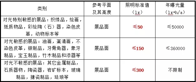 而《博物馆照明设计规范 GB/T23863-2009》与《建筑照明设计标准 GB50034-2013》中与博照度相关的部分,规定的是最高值!即文物表面的照度及年曝光量不能超过规定值。