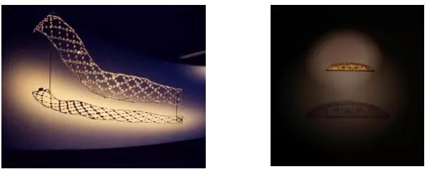 右图:古代女性金质装饰品上为实物使用小光束角度突出,下为线形纹样示意以大光束角投射;用