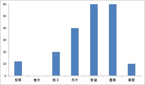黄檗:30000lx·h//紫草:60000lx·h//栀子:100000lx·h//苏木:200000lx·h//青黛:300000lx·h//莤草:300000lx·h