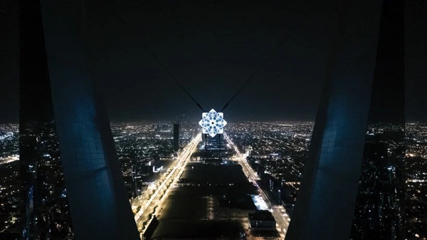 利雅得王国塔的“恒星”,由比利时艺术家Koert Vermeulen创作的灯光艺术装置《Star In Motion(运动中的星星)》。整个照明项目重达五吨,有520米长的LED灯带加上16个移动摄像头,加起来一共120万流照明,“点亮”整个城市。
