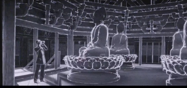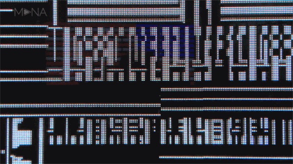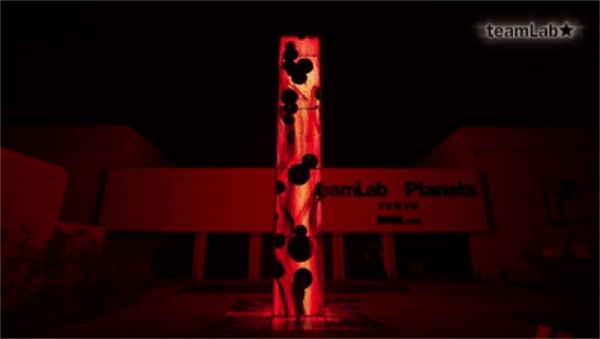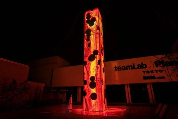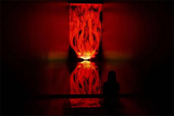 气体燃烧后产生出千变万化的粒子运动轨迹,这些无序的运动轨迹就组成了火焰。TeamLab利用“超主体空间”,直接将线条在一块长方形的屏幕上体现了出来。