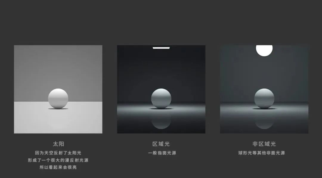 按照光源分类可以分为自然光(太阳)和人造光源。其中人造光根据不同特点分为区域光、非区域光。